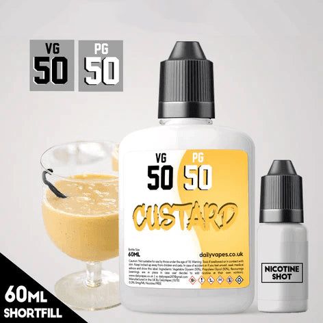 Flavour Description A good old fashioned vanilla custard. Bottle Info 50vg 50pg 0mg = 60ml bottle filled with 60ml of your chosen flavour. (NO NIC...