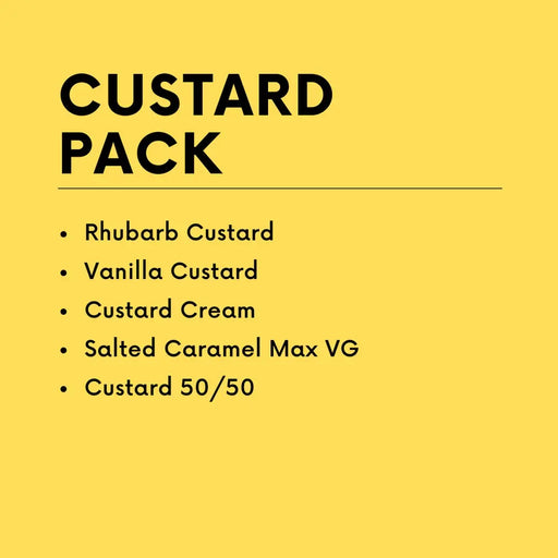 What You Get: 5x60ml Rhubarb Custard Vanilla Custard Custard Cream Salted Caramel Max VG Custard 50/50 Please Note: If you order...