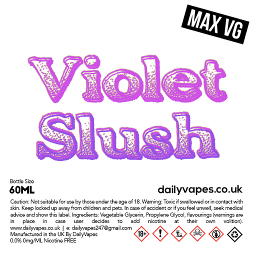 Flavour Description Sweet candy Parma Violet slush. Bottle Info Max VG (80VG+) 0mg = 60ml bottle filled with 60ml of your chosen flavour. (NO NI...